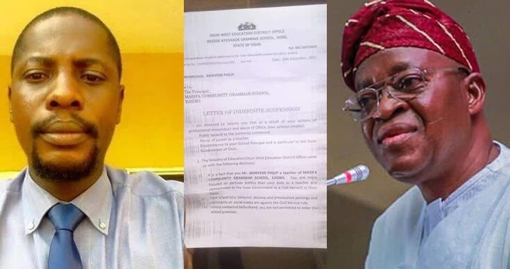 Part of the query letter read, “Your postings and comments on social media for some time have been inciting and have shown that you have derailed from what you were employed to do as a teacher. You are more focused on partisan politics than your duty as a teacher and commitment to the State Government as a Civil Servant in Osun State.