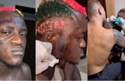 In a video shared via his Instagram page, Portable could be seen sitting on a chair while a White man gave him his desired drawings. One of the tattooes appears to be a casket on one side of his face and the inscription Ika of Africa on his forehead.