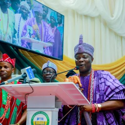 Oba Oyelude says, “Yoruba cultures are not demonic, so we must do everything possible to promote our cultures”, while receiving the award, at the 14th Toyin Falola International conference on Africa and the African Diaspora, hosted in Olagunsoye Oyinlola Auditorium, Osogbo Main Campus, on Tuesday, July 1st.