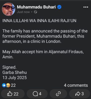 The post confirms Buhari’s death occurred in London, where he had spent time in the past receiving medical care. No specific cause of death was mentioned in the post.