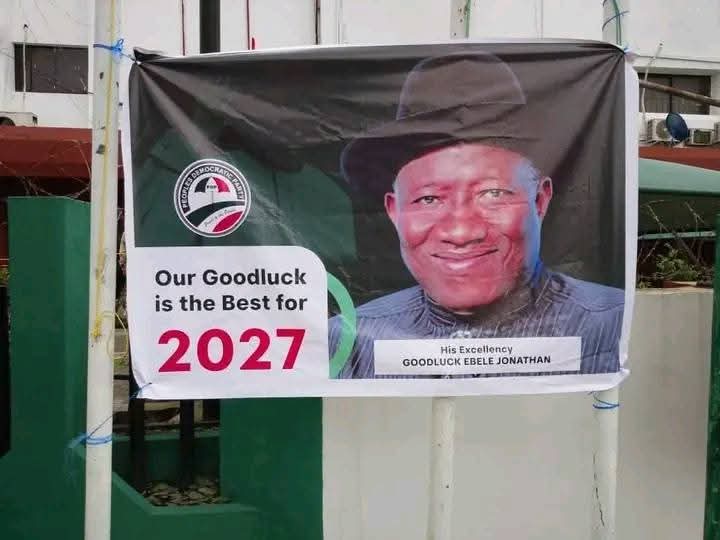 Ahead of 2027 general election, posters of former President Goodluck Ebele Jonathan have been seen at the Wadata House, the Peoples Democratic Party (PDP) headquarters in Abuja.