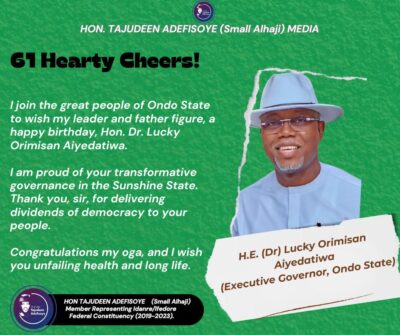 Hon. Tajudeen Adefisoye (Small Alhaji) has sent warm felicitations to Hon. Dr. Lucky Orimisan Aiyedatiwa, as Ondo State governor marks his 61st birthday, praising his decades of contribution to public service, transformative governance and national development.